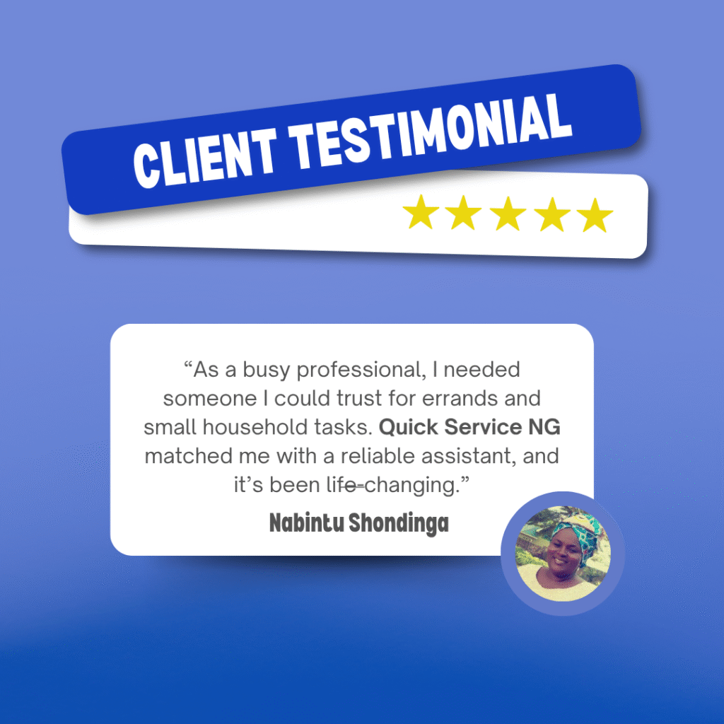 “Quick Service NG connected me with a reliable nanny within two days. She’s caring, trustworthy, and my kids love her. I finally have peace of mind!”